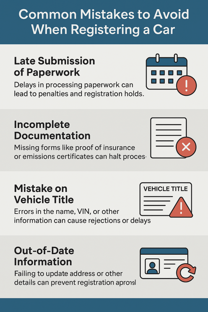 Inaccurate payment amounts, delivering documents to the incorrect processing center, entering out-of-date information, and neglecting to change addresses are common car registration errors that result in delays.